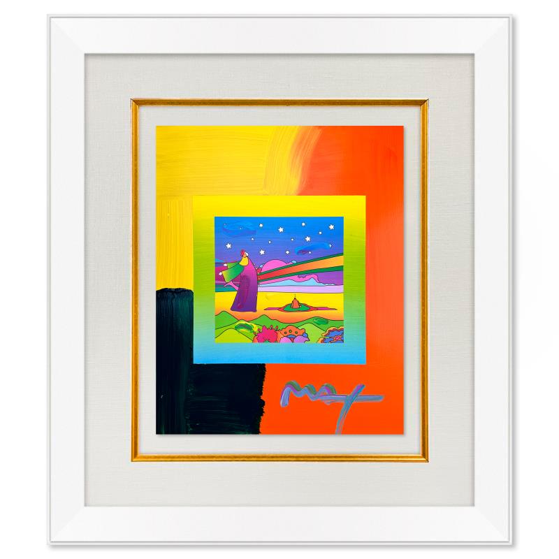 "2 Sages with Stars" is a one-of-a-kind mixed media on paper, hand signed by Peter Max. The piece comes custom framed with a backside cutout to display Peter Max Studio registration number 251518 certifying authenticity. Measures approximately 28" x 24" (frame), 19" x 15" (image). This item requires special handling and may have a longer than usual turnaround.