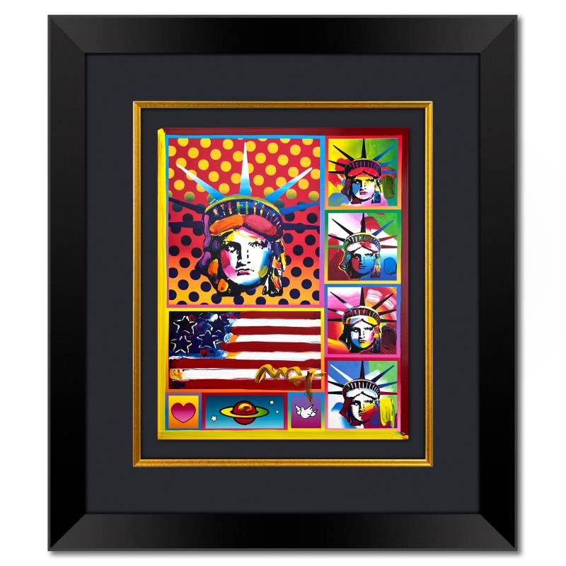 "5 Liberties and Flag" is a one-of-a-kind mixed media on paper, hand signed by Peter Max. The piece comes custom framed with a backside cutout to display Peter Max Studio registration number 215725 certifying authenticity. Measures approximately 28" x 24" (frame), 19" x 15" (image). This item requires special handling and may have a longer than usual turnaround.