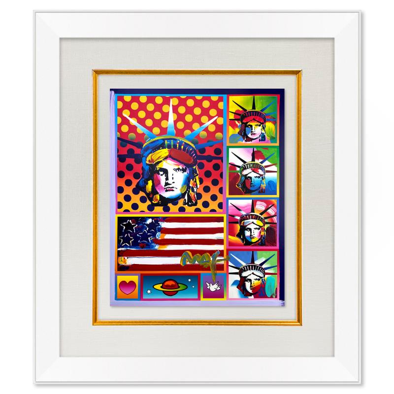 "5 Liberties and Flag" is a one-of-a-kind mixed media on paper, hand signed by Peter Max. The piece comes custom framed with a backside cutout to display Peter Max Studio registration number 215727 certifying authenticity. Measures approximately 28" x 24" (frame), 19" x 15" (image). This item requires special handling and may have a longer than usual turnaround.