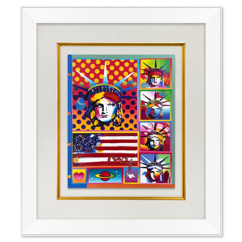 "5 Liberty and Flag" is a one-of-a-kind acrylic mixed media on paper, hand signed by Peter Max. The piece comes custom framed with a backside cutout to display Peter Max Studio registration number 168213 certifying authenticity. Measures approx. 28" x 24" (frame), 19" x 15" (image). This item requires special handling and may have a longer than usual turnaround.