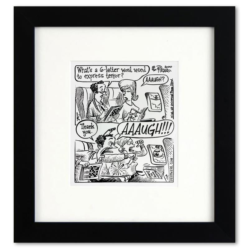 Enter a surreal and satirical world of twisted imagination and award winning creativity. "6 Letter Word" is an original pen & ink drawing on paper by Dan Piraro, creator of the critically acclaimed and award winning comic strip, Bizarro. This piece is hand signed, comes custom framed and includes a letter of authenticity. Measures approximately 12" x 11" (frame), 7" x 6" (image). This item requires special handling and may have a longer than usual turnaround.