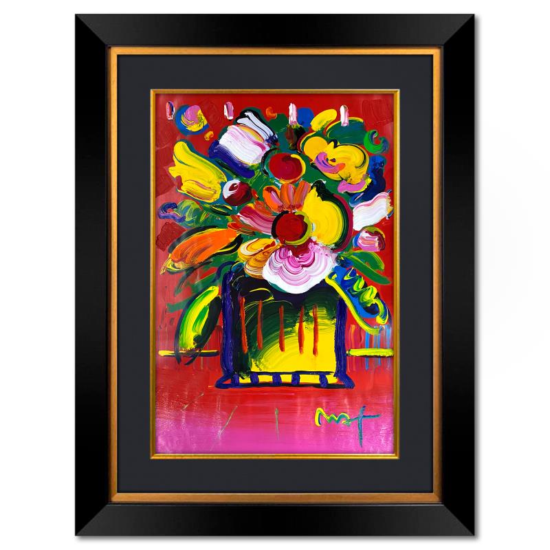 "Abstract Flower" is a one-of-a-kind mixed media on paper, hand signed by Peter Max. The piece comes custom framed with a backside cutout to display Peter Max Studio registration number 288266 certifying authenticity. Measures approximately 48" x 36" (frame), 36" x 24" (image). This item requires special handling and may have a longer than usual turnaround.
