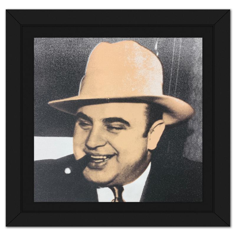 "Al Capone" is a hand pulled limited edition silkscreen on canvas by Andy Warhol protege, Steve Kaufman (1960-2010), numbered AP 18/50 inverso and hand signed by the artist. This piece comes custom framed. Includes Letter of Authenticity. Measures approx. 17.5" x 17.5" (frame), 14.5" x 14.5" (image). This item requires special handling and may have a longer than usual turnaround.