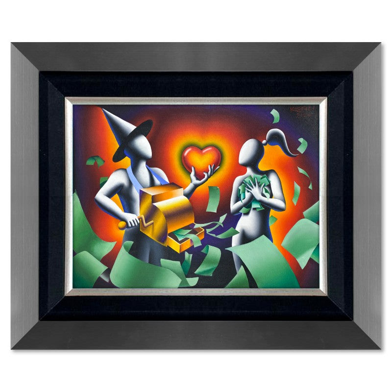 "All For Me" is an original oil painting on canvas by Mark Kostabi, hand signed by the artist. This piece comes custom framed. Includes Certificate of Authenticity. Measures approx. 27.5" x 33.5" (frame), 17.5" x 23.5" (image).