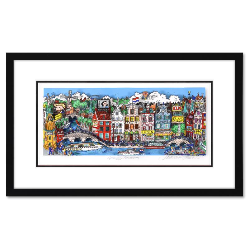 "Alluringly Amsterdam" is a 3D limited edition silk screen construct on paper by Charles Fazzino, DX numbered 350/4000 and hand signed by the artist. This piece comes custom framed. Includes Certificate of Authenticity. Measures approximately 23.5" x 14" (frame), 16" x 7" (image).