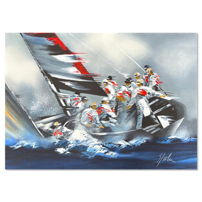 "America's Cup - Alinghi" is a limited edition lithograph on paper by Victor Spahn. Printed at Art-Lithographies workshop in Paris, the piece is hand signed by the artist and comes with a certificate of authenticity. Measures approximately 17" x 23.5" (image).