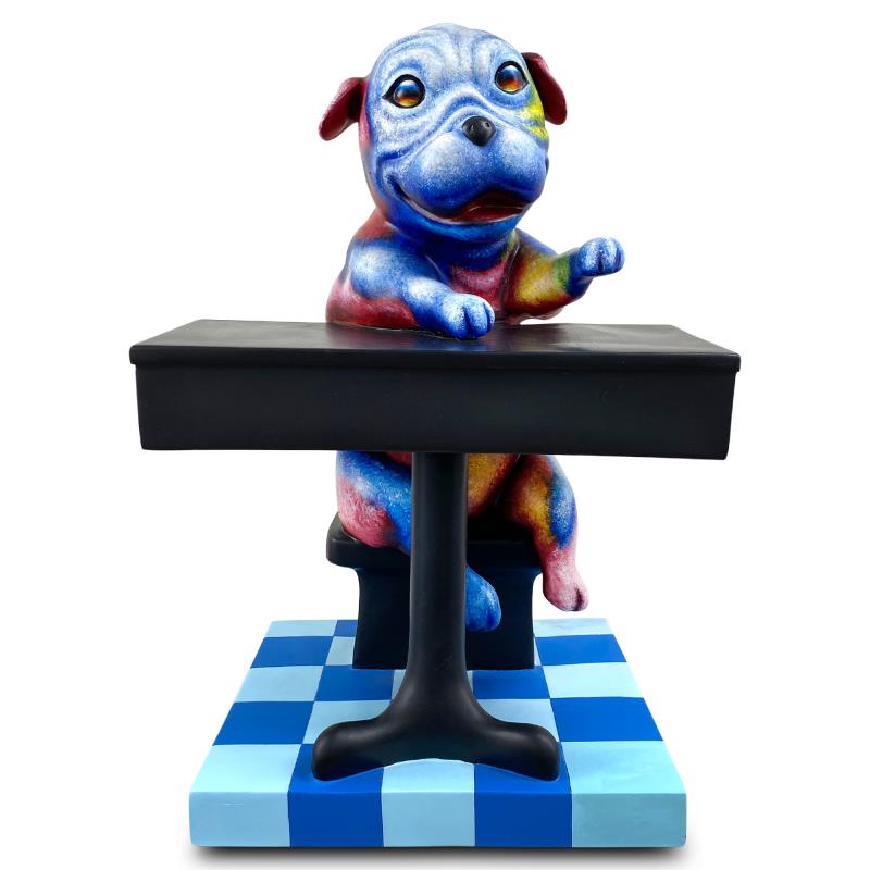 "Back to School Blues" is a hand painted limited edition, dimensional art, resin sculpture by Wang. This piece is numbered 6/99 and hand signed in verso. Includes Letter of Authenticity. Measures approx. 24" x 15.5" x 12.5 (base with sculpture).