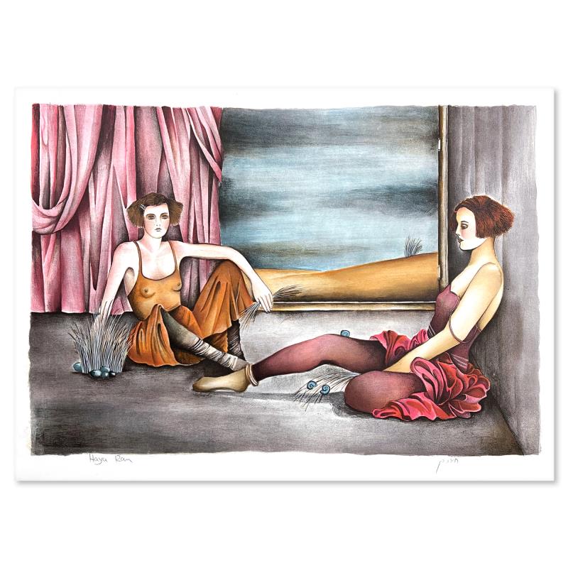 "Behind the Curtain" is a limited edition on paper by Haya Ran. The piece comes hand signed by the artist, numbered, and with a letter of authenticity. Measures approximately 15.5" x 22".