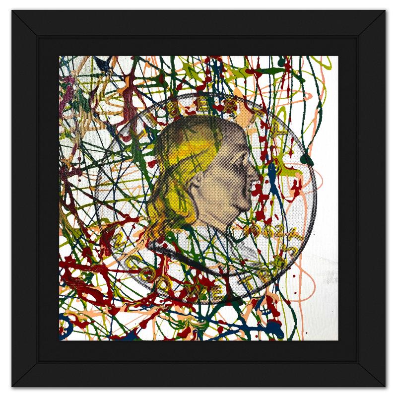 "Ben Half Dollar" is a hand embellished limited edition silkscreen on canvas by Andy Warhol protege, Steve Kaufman (1960-2010), numbered 17/50 inverso and hand signed by the artist. This piece comes custom framed. Includes Letter of Authenticity. Measures approx. 14.5" x 14" (frame), 11.5" x 11" (image). This item requires special handling and may have a longer than usual turnaround.