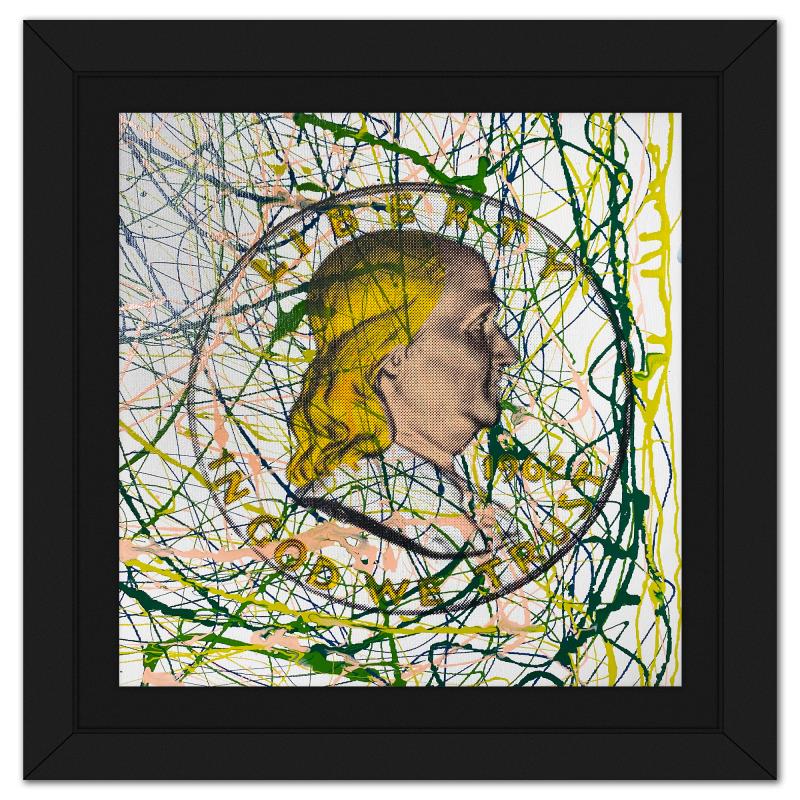 "Ben Half Dollar" is a hand embellished limited edition silkscreen on canvas by Andy Warhol protege, Steve Kaufman (1960-2010), numbered 8/50 inverso and hand signed by the artist. This piece comes custom framed. Includes Letter of Authenticity. Measures approx. 14.5" x 14" (frame), 11.5" x 11" (image). This item requires special handling and may have a longer than usual turnaround.