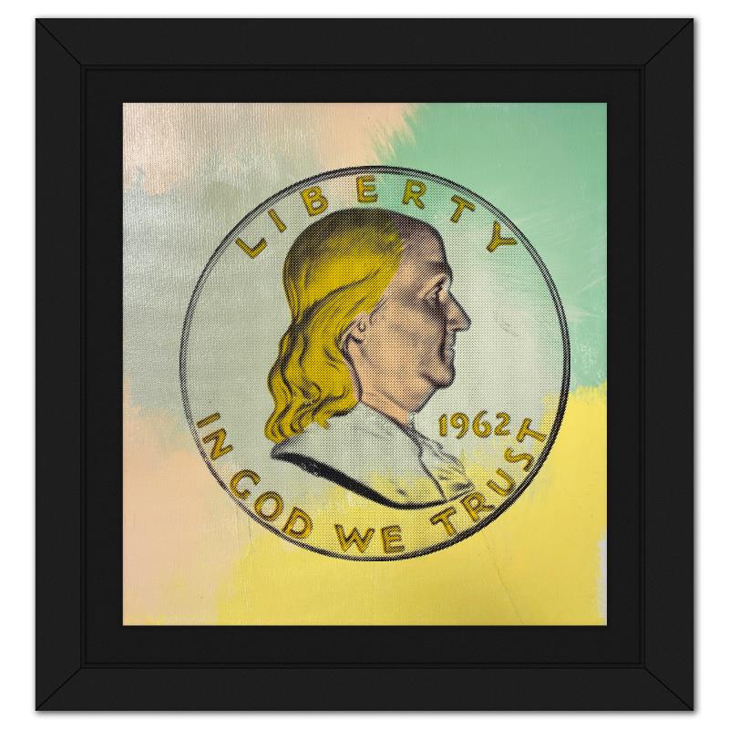 "Ben Half Dollar" is a hand embellished limited edition silkscreen on canvas by Andy Warhol protege, Steve Kaufman (1960-2010), numbered 16/50 inverso and hand signed by the artist. This piece comes custom framed. Includes Letter of Authenticity. Measures approx. 14.5" x 14" (frame), 11.5" x 11" (image). This item requires special handling and may have a longer than usual turnaround.