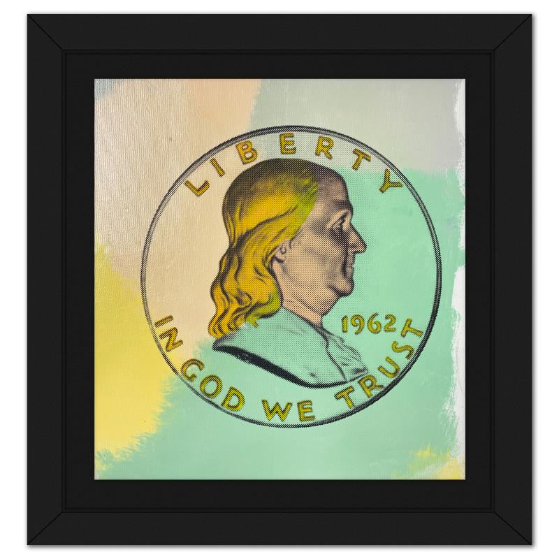 "Ben Half Dollar" is a hand embellished limited edition silkscreen on canvas by Andy Warhol protege, Steve Kaufman (1960-2010), numbered 34/50 inverso and hand signed by the artist. This piece comes custom framed. Includes Letter of Authenticity. Measures approx. 14.5" x 14" (frame), 11.5" x 11" (image). This item requires special handling and may have a longer than usual turnaround.