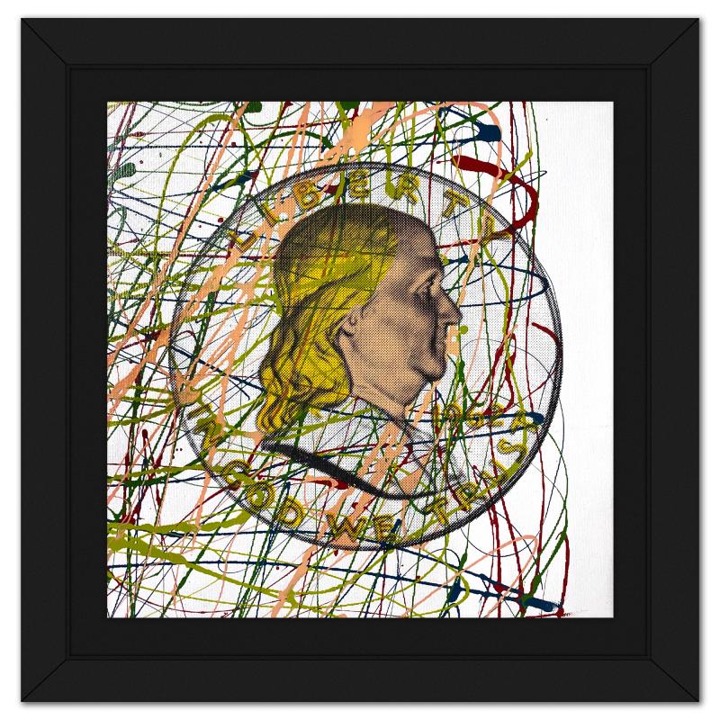 "Ben Half Dollar" is a hand embellished limited edition silkscreen on canvas by Andy Warhol protege, Steve Kaufman (1960-2010), numbered 37/50 inverso and hand signed by the artist. This piece comes custom framed. Includes Letter of Authenticity. Measures approx. 14.5" x 14" (frame), 11.5" x 11" (image). This item requires special handling and may have a longer than usual turnaround.