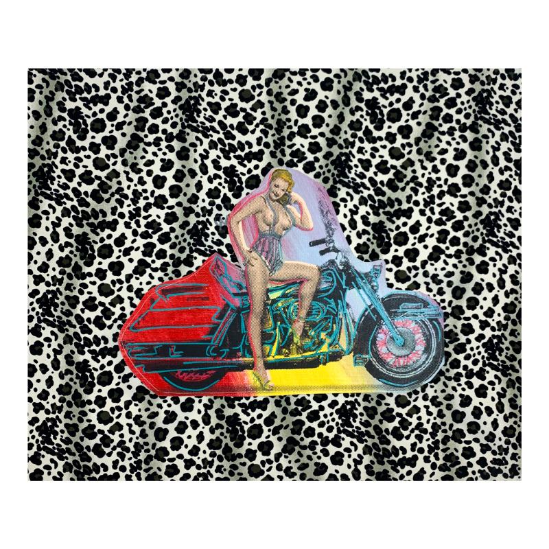 "Biker Gal" is limited edition hand pulled silkscreen unique mixed media on canvas and textile by Andy Warhol protege Steve Kaufman (1960-2010). This piece is numbered and hand signed inverso and includes a letter of authenticity. As is common with Kaufman's works, this piece may have perceived minor flaws, but is in overall good condition. Measures approximately 21" x 24.5" before cropping.
