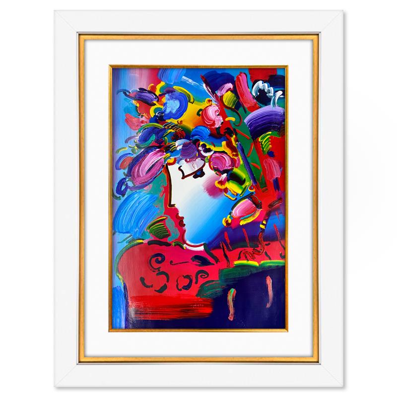 "Blushing Beauty" is a one-of-a-kind mixed media on paper, hand signed by Peter Max. The piece comes custom framed with a backside cutout to display Peter Max Studio registration number 253184 certifying authenticity. Measures approximately 48" x 36" (frame), 36" x 24" (image).