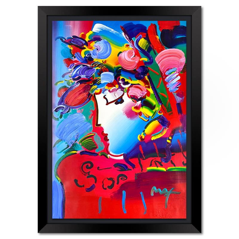"Blushing Beauty" is a one-of-a-kind mixed media on paper, hand signed by Peter Max. The piece comes custom framed with a backside cutout to display Peter Max Studio registration number 253880 certifying authenticity. Measures approximately 42" x 30" (frame), 36" x 24" (image). This item requires special handling and may have a longer than usual turnaround.