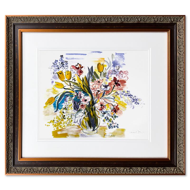 "Bouquet De Fleurs Dans" is a framed limited edition lithograph on paper by Raoul Dufy authorized by Dufy owners of rights and ADAGP Paris. The piece is plate signed and comes with a letter of authenticity. Measures approximately 28.5" x 26.5" (frame), 18" x 21.5" (image).