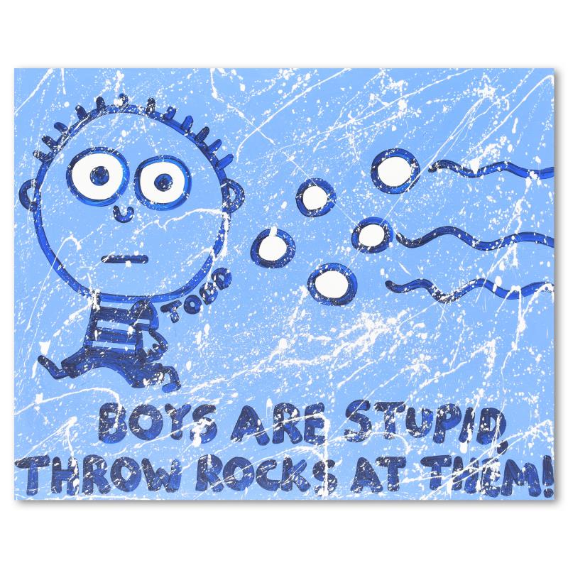 "Boys Are Stupid" is an original acrylic painting on gallery wrapped canvas by Todd Goldman, hand signed by the artist. Includes Letter of Authenticity. Measures approx. 60" x 48" (image). Due to the way this piece was stored there may be minor wear or signs of age (such as wear on the corners) but the piece is in overall good condition.