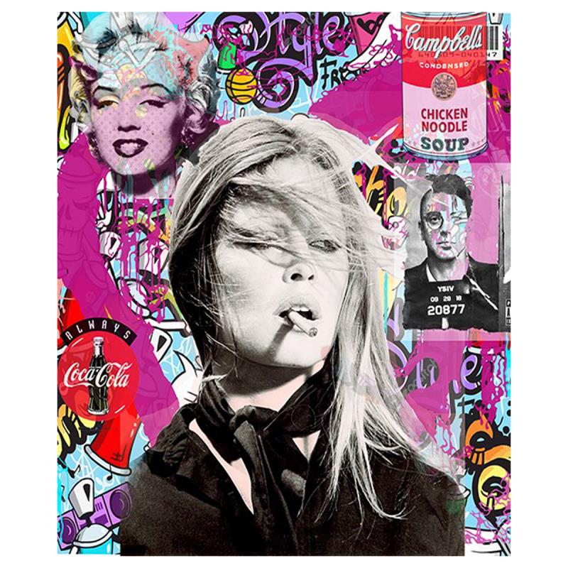 "Brigitte" is a unique mixed media acrylic embellished with glitter dust on gallery wrapped canvas by Jozza. Hand Signed by the artist and titled in verso, the piece comes with a letter of authenticity. Measures approximately 48" x 40" (image).