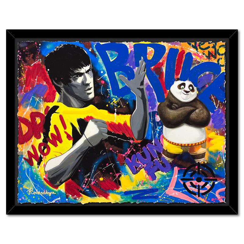 Nastya Rovenskaya, "Bruce Lee & Kung Fu Panda" Framed Unique Mixed Media, Hand Signed with Letter of Authenticity.