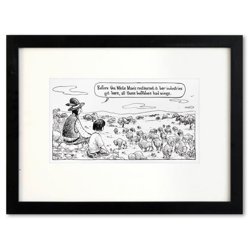 Enter a surreal and satirical world of twisted imagination and award winning creativity. "Buffalo Wings" is an original pen & ink drawing on paper by Dan Piraro, creator of the critically acclaimed and award winning comic strip, Bizarro. This piece is hand signed, comes custom framed and includes a letter of authenticity. Measures approximately 14" x 21" (frame), 7" x 13" (image). This item requires special handling and may have a longer than usual turnaround.