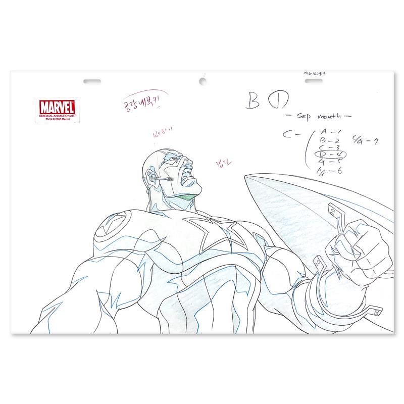 "Captain America" is an original production drawing on animation paper by Marvel Comics. Includes Letter of Authenticity. Measures approx. 14" x 10" (image).