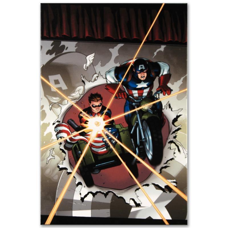 A piece of comic book history, this limited edition, from original art by Ed McGuinness, features the duo of Captain America and his long time friend Bucky. In May 2006, McGuinness entered an exclusive two-year contract with Marvel Comics. His first printed Marvel piece was a cover for the Marvel limited series Civil War. He is best known for his work on the "Red Hulk" series. "Captain America and Bucky #621" is a limited edition numbered giclee on stretched canvas by Ed McGuinness presented by Marvel Comics. This piece comes gallery wrapped. Includes Certificate of Authenticity! Measure approx. 18" x 27" (image); 1.5" (depth). This item requires special handling and may have a longer than usual turnaround.