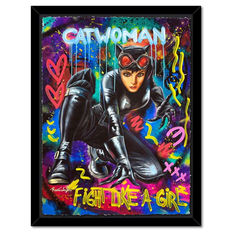 "Catwoman" is a one-of-a-kind mixed media on deckle edge paper by Nastya Rovenskaya; hand signed by the artist. This piece comes custom framed and includes letter of authenticity. Measures approximately 46" x 36" (framed), 40" x 30" (image).
