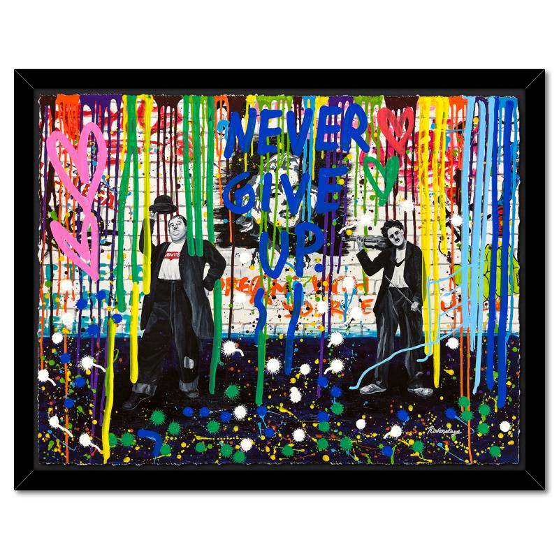 "Chaplin and Hardy" is a one-of-a-kind mixed media on deckle edge paper by Nastya Rovenskaya; hand signed by the artist. This piece comes custom framed and includes letter of authenticity. Measures approximately 36" x 46" (framed), 30" x 40" (image). This item requires special handling and may have a longer than usual turnaround.