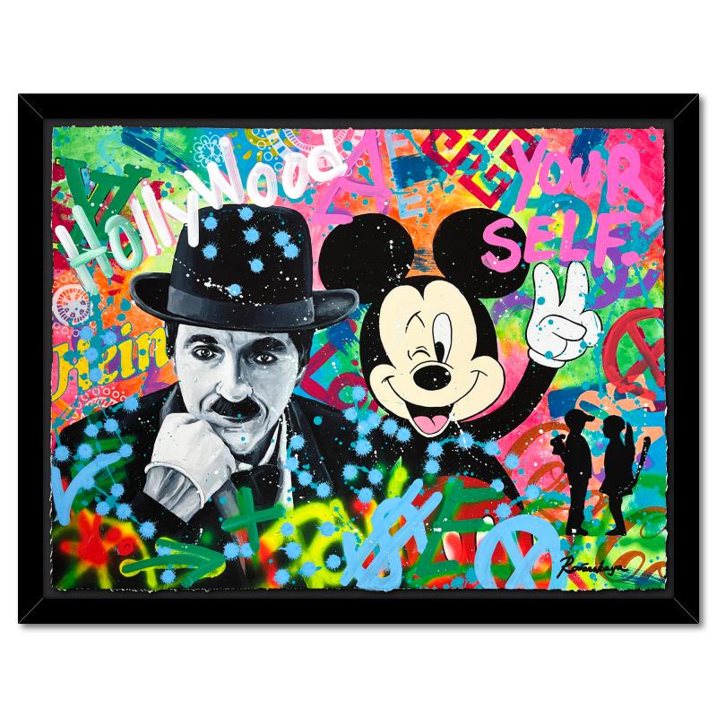 "Chaplin & Mickey Mouse" is a one-of-a-kind mixed media on deckle edge paper by Nastya Rovenskaya; hand signed by the artist. This piece comes custom framed and includes letter of authenticity. Measures approximately 36" x 46" (framed), 30" x 40" (image).