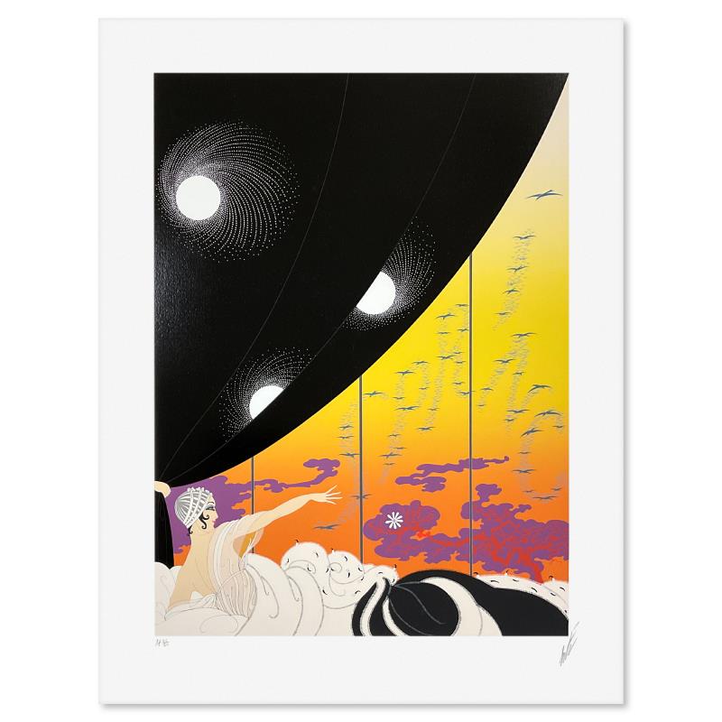 "Coming of Spring" is a limited edition serigraph on paper by Erte (1892-1990), AP numbered 25/60 and hand signed by the artist. Includes Letter of Authenticity. Measures approx. 30" x 23" (border), 25" x 18" (image).