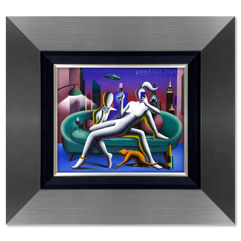 "Cosmic Comfort"is an original oil painting on canvas by Mark Kostabi, hand signed by the artist. This piece comes custom framed. Includes Certificate of Authenticity. Measures approx. 22" x 20" (frame), 10" x 12" (image). This item requires special handling and may have a longer than usual turnaround.