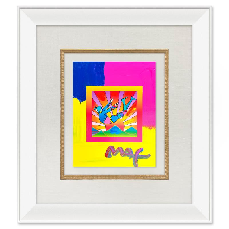 "Cosmic Flyer" is a hand signed one-of-a-kind acrylic mixed media on paper by Peter Max. The piece comes custom framed with a backside cutout to display Peter Max Studio registration number 299529 certifying authenticity. Measures approximately 26" x 23" (frame), 13" x 10" (image). This item requires special handling and may have a longer than usual turnaround.