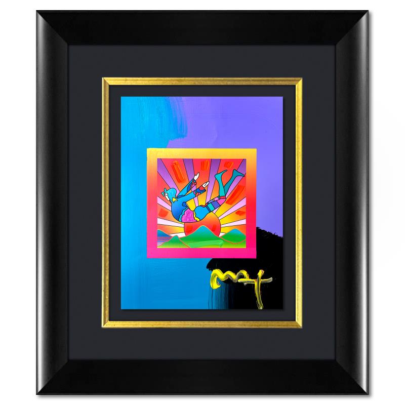 "Cosmic Flyer" is a hand signed one-of-a-kind acrylic mixed media on paper by Peter Max. The piece comes custom framed with a backside cutout to display Peter Max Studio registration number 267154 certifying authenticity. Measures approximately 30" x 26" (frame), 17" x 13" (image). This item requires special handling and may have a longer than usual turnaround.