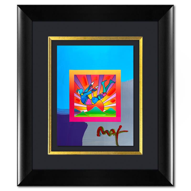 "Cosmic Flyer" is a hand signed one-of-a-kind acrylic mixed media on paper by Peter Max. The piece comes custom framed with a backside cutout to display Peter Max Studio registration number 267936 certifying authenticity. Measures approximately 30" x 26" (frame), 17" x 13" (image). This item requires special handling and may have a longer than usual turnaround.