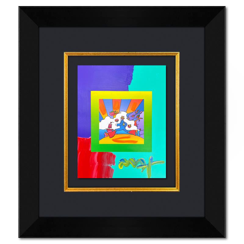 "Cosmic Runner" is a hand signed one-of-a-kind acrylic mixed media on paper by Peter Max. The piece comes custom framed with a backside cutout to display Peter Max Studio registration number 285614 certifying authenticity. Measures approximately 26" x 23" (frame), 13" x 10" (image).