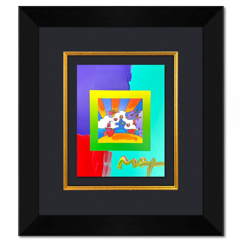"Cosmic Runner" is a hand signed one-of-a-kind acrylic mixed media on paper by Peter Max. The piece comes custom framed with a backside cutout to display Peter Max Studio registration number 285593 certifying authenticity. Measures approximately 26" x 23" (frame), 13" x 10" (image). This item requires special handling and may have a longer than usual turnaround.
