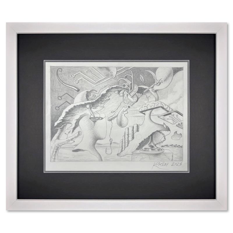"Cracked Consciousness" is an original drawing on paper by Mark Kostabi, hand signed by the artist. This piece comes custom framed and includes a certificate of authenticity. Measures approximately 14.5" x 17" (frame), 8.5" x 11" (image). This item requires special handling and may have a longer than usual turnaround.