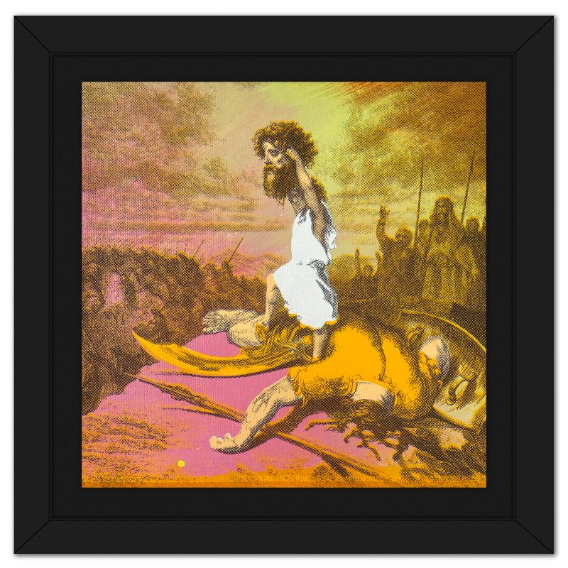 "David Goliath" is a hand embellished limited edition silkscreen on canvas by Andy Warhol protege, Steve Kaufman (1960-2010), numbered AP 13/50 inverso and hand signed by the artist. This piece comes custom framed. Includes Letter of Authenticity. Measures approx. 16.5" x 16.5" (frame), 13.5" x 13.5" (image). This item requires special handling and may have a longer than usual turnaround.