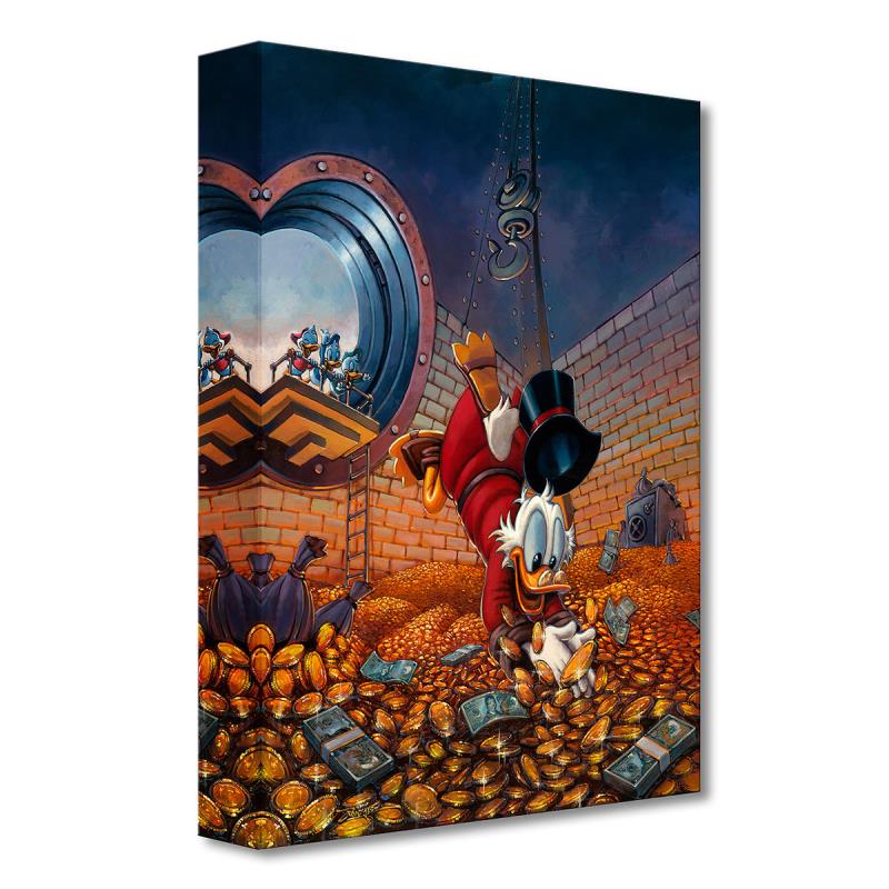 "Diving into Gold" is a limited edition giclee on canvas by Rodel Gonzalez. Part of the Treasures collection from Disney Fine Art, this limited edition featuring Duck Tales imagery comes gallery wrapped and ready to hang and comes with a certificate of authenticity. The edition is limited to 1500 pieces. Item measures approximately 16" x 12".