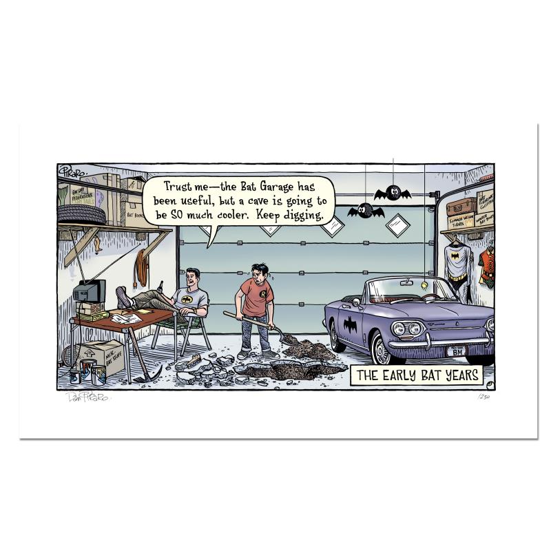 "Early Batman" is a limited edition giclee on paper by Dan Piraro, creator of the critically acclaimed and award winning comic strip, Bizarro! This piece is numbered and hand signed by the artist and includes aletterof authenticity. Measures approximtely 8" x 15" (image).
