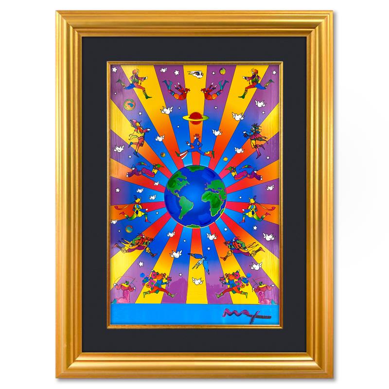 "Earth Day 2000" is a one-of-a-kind mixed media on paper, hand signed by Peter Max. The piece comes custom framed with a backside cutout to display Peter Max Studio registration number 287009 certifying authenticity. Measures approximately 48" x 36" (frame), 36" x 24" (image). This item requires special handling and may have a longer than usual turnaround.
