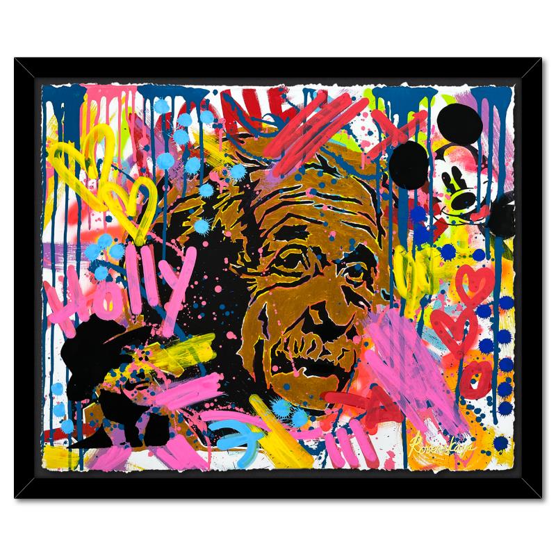"Einstein In Gold" is a one-of-a-kind mixed media on deckle edge paper by Nastya Rovenskaya; hand signed by the artist. This piece comes custom framed and includes letter of authenticity. Measures approximately 30.5" x 36" (framed), 24.5" x 30" (image).