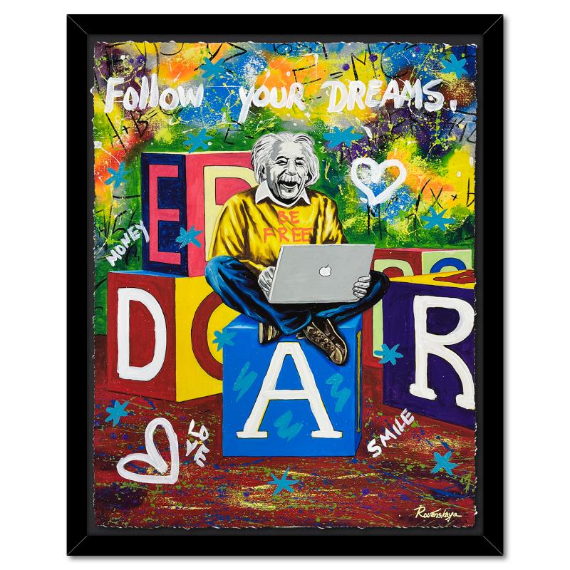 "Einstein's Laptop" is a one-of-a-kind mixed media on deckle edge paper by Nastya Rovenskaya; hand signed by the artist. This piece comes custom framed and includes letter of authenticity. Measures approximately 36" x 30" (framed), 30" x 24" (image).