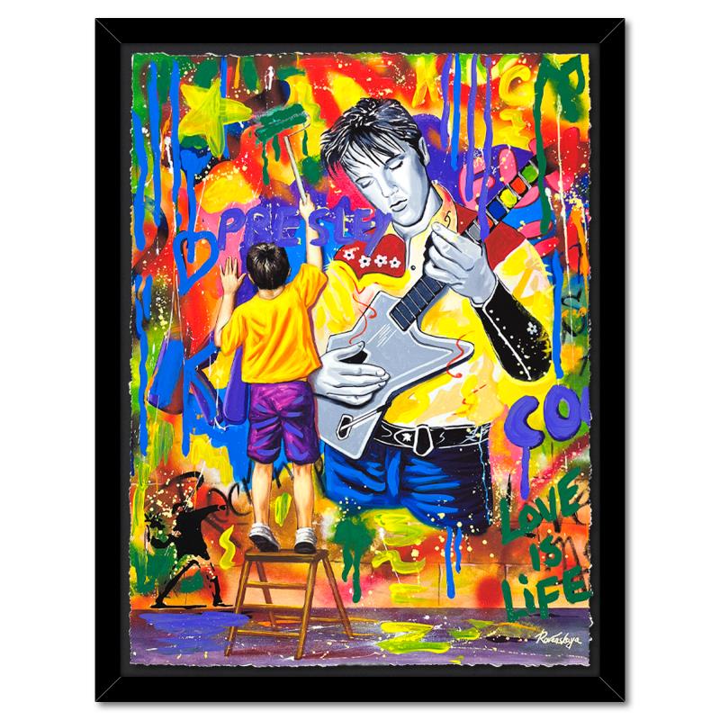 "Elvis Presley" is a one-of-a-kind mixed media on deckle edge paper by Nastya Rovenskaya; hand signed by the artist. This piece comes custom framed and includes letter of authenticity. Measures approximately 36.5" x 30" (framed), 30.5" x 24" (image). This item requires special handling and may have a longer than usual turnaround.