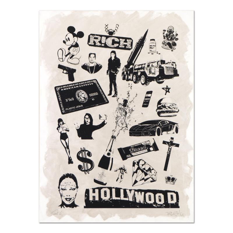 "False Idols I: Plastic Jesus" is a one-of-a-kind hand painted silkscreen mixed media on canvas, hand signed by the artist. Includes Letter of Authenticity. Measures approx. Measures approx. 22" x 30" (image).