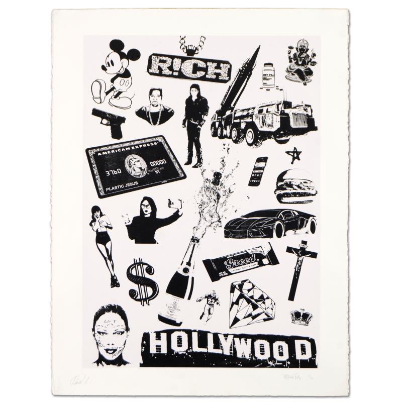 "False Idols I: Plastic Jesus" is a limited edition silkscreen on deckle edge paper, numbered and hand signed by the artist. Includes Letter of Authenticity. Measures approx. Measures approx. 22" x 30" (image).
