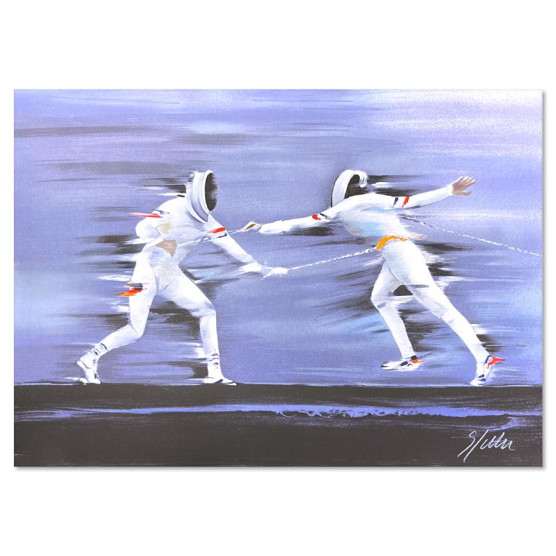 "Fencing" is a limited edition lithograph on paper by Victor Spahn. Printed at Art-Lithographies workshop in Paris, the piece is hand signed by the artist and comes with a certificate of authenticity. Measures approximately 17" x 23.5" (image).