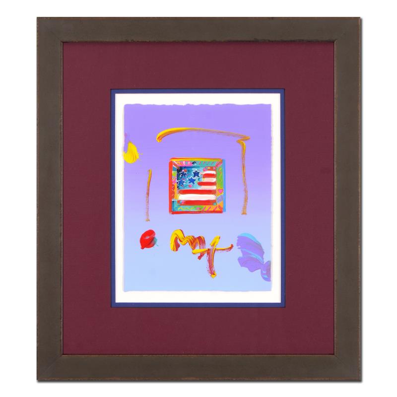 "Flag" is a one-of-a-kind acrylic mixed media on deckle-edge paper, hand signed by Peter Max. Includes Certificate of Authenticity from Peter Max Studios. This piece comes custom framed. Measures approx. 18.5" x 21" (with frame), 8.5" x 11" (image).