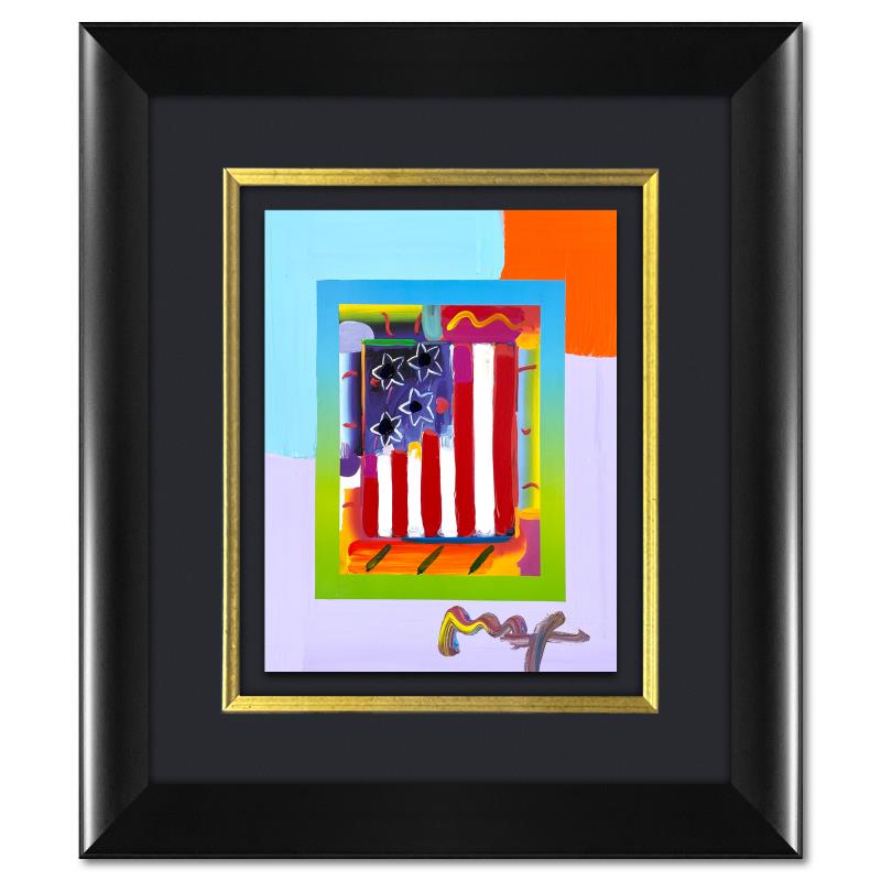"Flag" is a one-of-a-kind acrylic mixed media on paper, hand signed by Peter Max. The piece comes custom framed with a backside cutout to display Peter Max Studio registration number 259607 certifying authenticity. Measures approx. 30" x 26" (frame), 17" x 13" (image). This item requires special handling and may have a longer than usual turnaround.